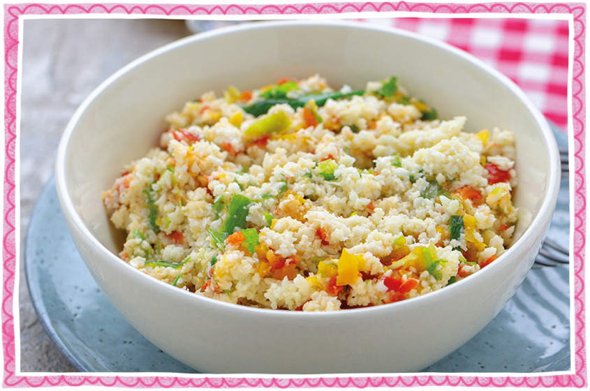 Warm cauliflower rice and spicy chicken salad